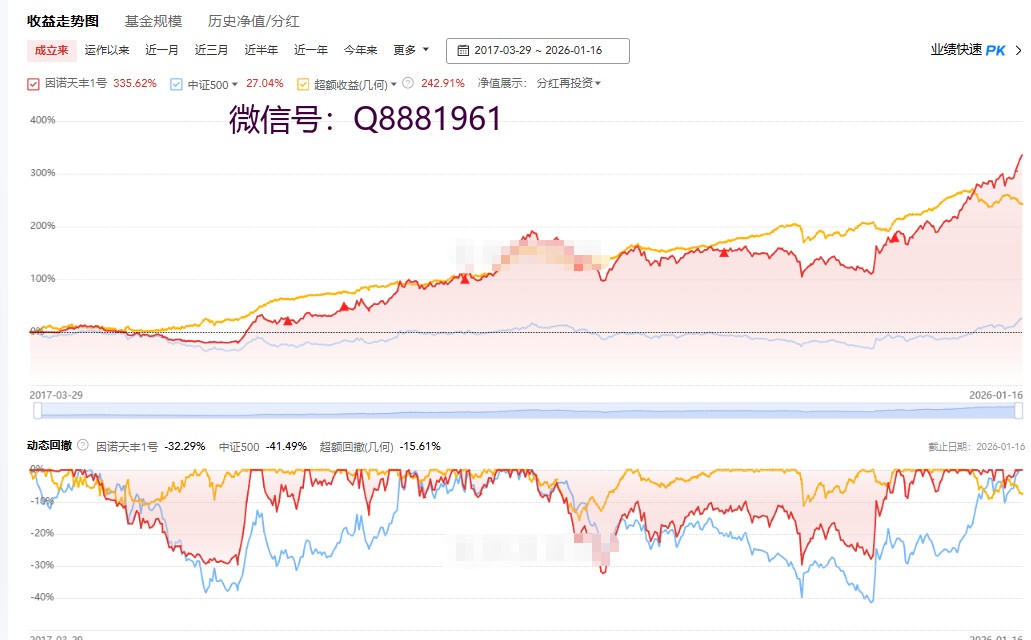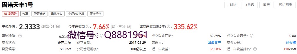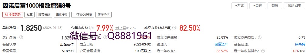 该只私募基金产品为R5高风险,今年以来的收益为3.41%,成立1.7年以来的收益为34.21%,其中我们来看一下具体数据,成立以来的夏普比为1.53,成立以来的回撤为6.45%,单位净值为1.3421,通过图片,可以观察到这支基金产品的基金规模,截止到2026/1/16的累计净值为1.3421。想追踪最新的基金信息,微信扫描文章下方二维码了解更多信息,加我微信不迷路。