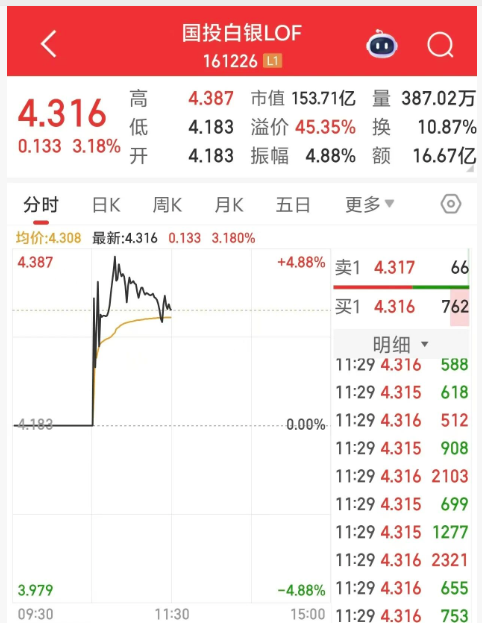 同花顺数据显示,1月27日,国投白银LOF复牌后冲高回落,盘中交易价格最高触及4.387元,再创历史新高。截至上午收盘,国投白银LOF场内交易价格为4.316元,涨幅超3%,溢价率超45%。