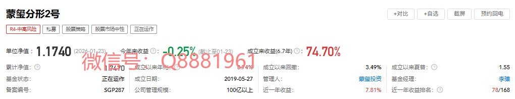 该只私募基金产品为R4中高风险,今年以来的收益为-0.25%,成立6.7年以来的收益为74.70%,其中我们来看一下具体数据,成立以来的夏普比为1.55,成立以来的回撤为3.49%,单位净值为1.1740,通过图片,可以观察到这支基金产品的基金规模,截止到2026/1/23的累计净值为1.1740。想追踪最新的基金信息,微信扫描文章下方二维码了解更多信息,加我微信不迷路。