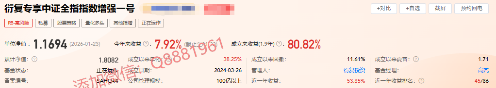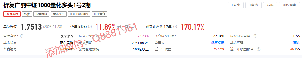 该只私募基金产品为R5高风险,今年以来的收益为11.89%,成立4.7年以来的收益为170.17%,其中我们来看一下具体数据,成立以来的夏普比为0.95,成立以来的回撤为22.04%,单位净值为1.7513,通过图片,可以观察到这支基金产品的基金规模,截止到2026/1/23的累计净值为2.2665。想追踪最新的基金信息,微信扫描文章下方二维码了解更多信息,加我微信不迷路。