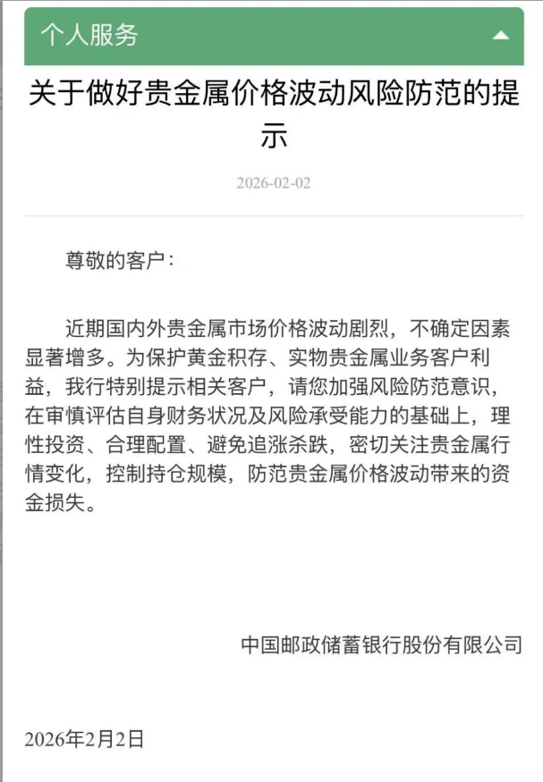 同时,邮储银行发布《关于做好贵金属价格波动风险防范的提示》称,近期国内外贵金属市场价格波动剧烈,不确定因素显著增多。为保护黄金积存、实物贵金属业务客户利益,特别提示相关客户,请加强风险防范意识,在审慎评估自身财务状况及风险承受能力的基础上,理性投资、合理配置、避免追涨杀跌,密切关注贵金属行情变化,控制持仓规模,防范贵金属价格波动带来的资金损失。