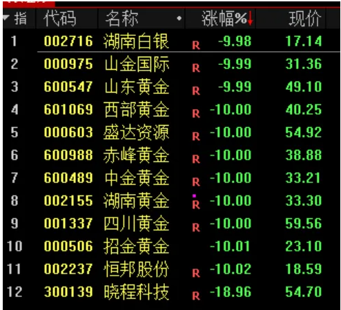 下跌方面,资源股集体调整,贵金属、油气方向领跌,中金黄金、四川黄金、准油股份等多股跌停。