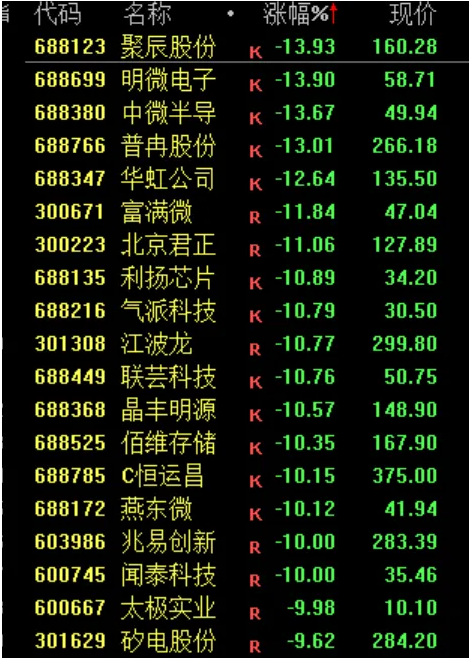 半导体芯片股下挫,兆易创新、闻泰科技等跌停,华虹公司、北京君正等跌超10%。