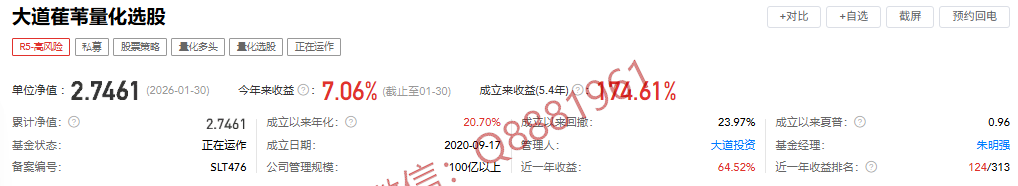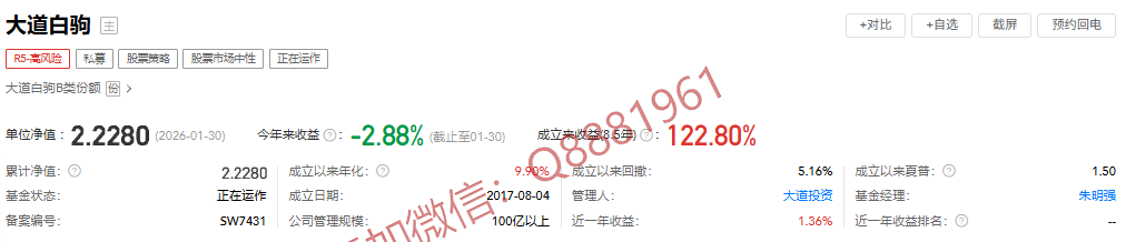 该只私募基金产品为R5高风险,今年以来的收益为-2.88%,成立8.5年以来的收益为122.80%,其中我们来看一下具体数据,成立以来的夏普比为1.50,成立以来的回撤为5.16%,单位净值为2.2280,通过图片,可以观察到这支基金产品的基金规模,截止到2026/1/30的累计净值为2.2280。想追踪最新的基金信息,微信扫描文章下方二维码了解更多信息,加我微信不迷路。