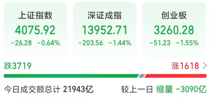 今日,A股三大指数回调。截至收盘,上证指数跌0.64%,深证成指跌1.44%,创业板指跌1.55%。