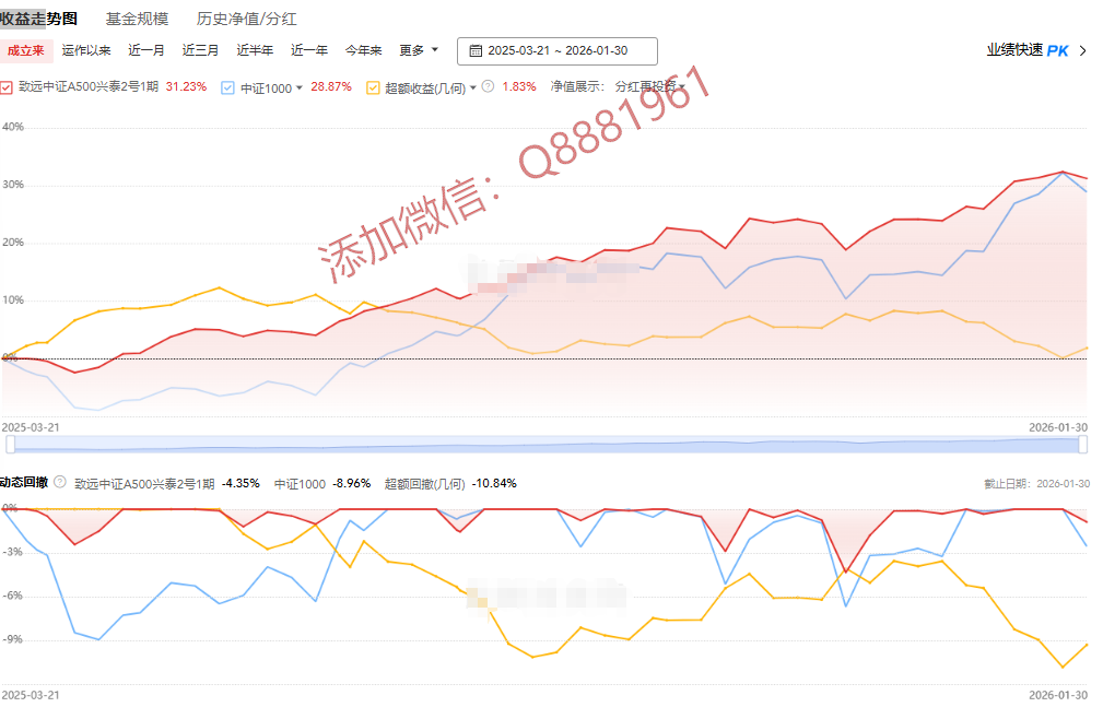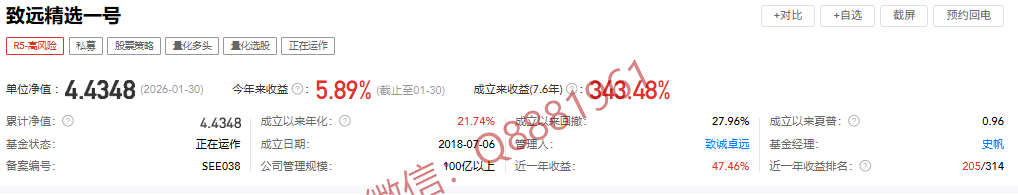 该只私募基金产品为R5高风险,今年以来的收益为5.89%,成立7.6年以来的收益为343.48%,其中我们来看一下具体数据,成立以来的夏普比为0.96,成立以来的回撤为27.96%,单位净值为4.4348,通过图片,可以观察到这支基金产品的基金规模,截止到2026/1/30的累计净值为4.4348。想追踪最新的基金信息,微信扫描文章下方二维码了解更多信息,加我微信不迷路。