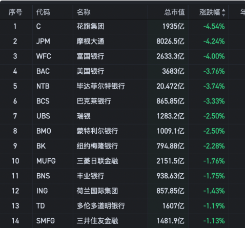 以上这些银行股几乎全部都是破位下跌的,银行股集体下跌,主要是因为市场对美联储降息预期显著降温,美债收益率上行压缩了银行净息差改善空间;同时,美国信用卡利率上限等监管政策冲击盈利预期,叠加信贷质量隐忧和资金从防御性银行板块向 AI 等高成长赛道轮动,共同引发了板块的同步调整。组建优质百人私募群,专注私募策略研究、收益复盘,百万起投朋友私信微信Q8881961。