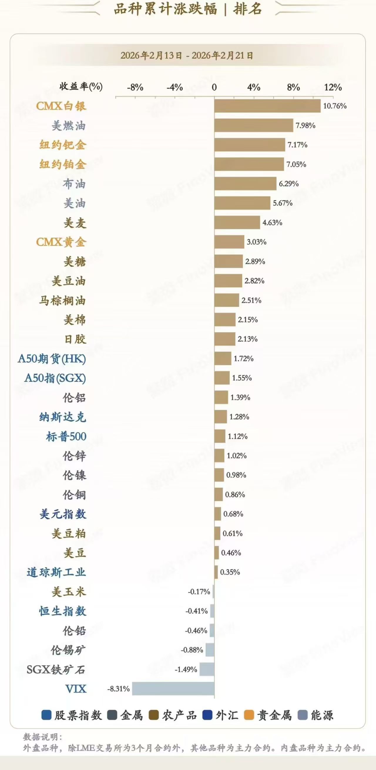 刚刚过去的一周(2026 年 2 月 13 日 - 2 月 21 日),全球市场呈现出清晰的主线:贵金属与能源板块强势领跑,而市场恐慌情绪则显著降温。下面我为大家梳理一下核心数据和背后的逻辑。