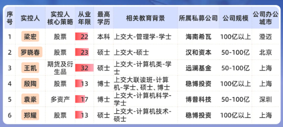根据私募排排网不完全统计,头部私募实控人出自上海交通大学(本硕博皆可)的有6位,占比约2.5%。其中,百亿私募实控人、准百亿私募实控人各占3位,包括海南希瓦梁宏、稳博投资殷陶和郑耀等。