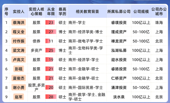 根据私募网站不完全统计,头部私募实控人出自南开大学(本硕博皆可)的有9位,占比约3.7%。其中,百亿私募实控人5位、准百亿私募实控人4位,包括睿璞投资蔡海洪、淡水泉赵军、仁桥资产夏俊杰等。
