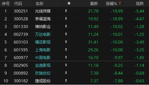 2月24日早间开盘,影视股即集体下挫。截至收盘,光线传媒、博纳影业、万达电影、横店影视、上海电影、中国电影等跌停,幸福蓝海、金逸影视、欢瑞世纪等均有较大跌幅。