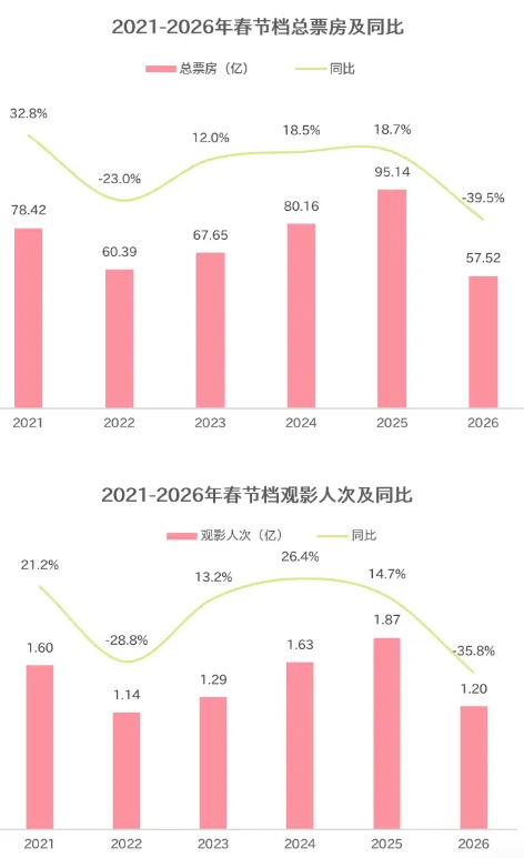 刚刚结束的春节档,总票房达到57.52亿元,比去年同期减少37.62亿元;总观影人次1.2亿,同比减少0.67亿。