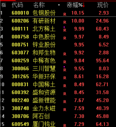 稀土永磁板块拉升,包钢股份、中色股份等涨停。