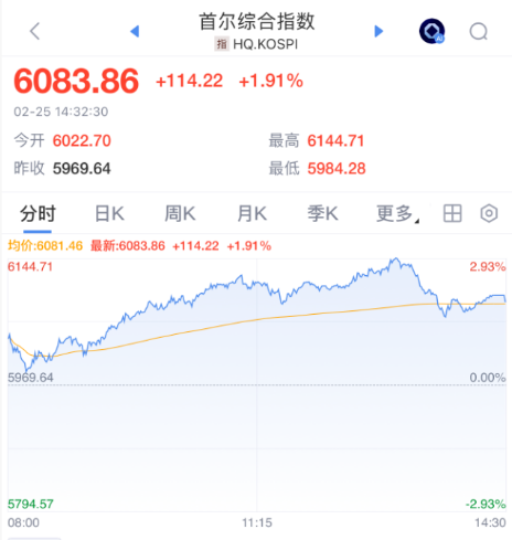 2月25日,韩国综合股价指数(KOSPI)开盘突破6000点,创历史新高。KOSPI今年1月22日盘中突破5000点,仅在一个多月的时间内指数累计上涨逾1000点。