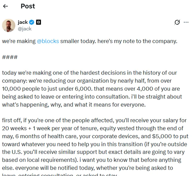 2月26日周四,Block在一封致股东信中宣布裁员计划。CEO Jack Dorsey在股东信中坦言,员工当天才获悉裁员消息,并预判大多数企业将在未来一年内被迫作出类似的结构性调整。他写道: