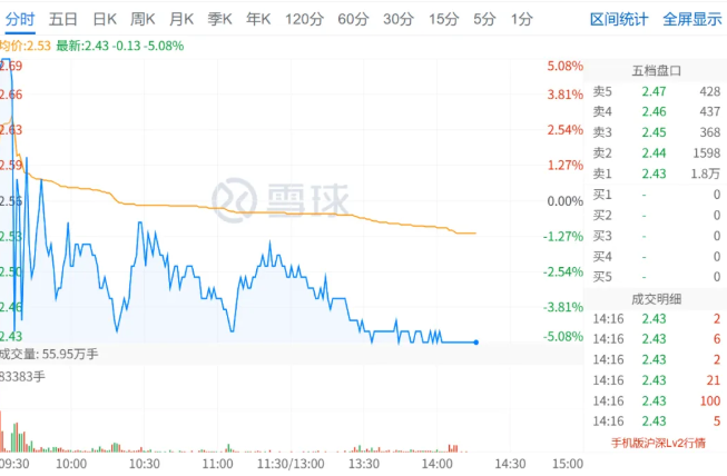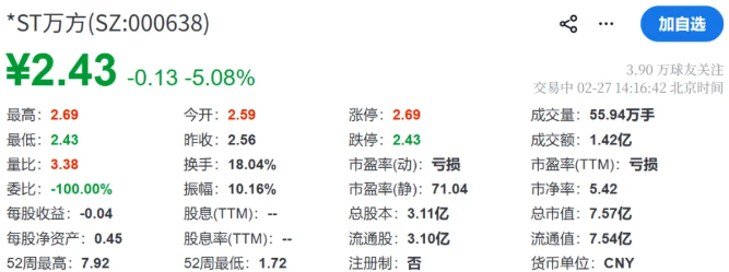 2月27日,*ST万方盘初涨停,报2.69元/股。随后直线跳水,一度触及跌停,上演“天地板”行情。午后,*ST万方封住跌停板,报2.43元/股。截至发稿,*ST万方仍保持跌停状态,成交额为1.2亿元。