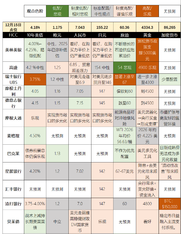 判断相对保守,部分预测已经在年底前兑现:和去年一样,外资行的预测基本是当年行情的延续,很少能有激进和反转的预测,诸如黄金、人民币上涨的目标点位,在展望发布后的不久已经达到目标点位;但这次能看到巴克莱、麦格理这类非美资的投行,能清晰提示美股风险。