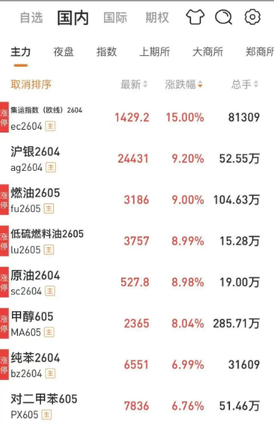 受中东地缘局势紧张影响,今日国内商品期货大面积收涨,能化板块多个品种涨停。截至15时收盘,集运指数(欧线)期货主力合约涨停,涨幅15%;燃油、低硫燃料油、原油期货涨停,涨幅9%;甲醇期货涨停,涨幅8%;纯苯期货涨停,涨幅7%。