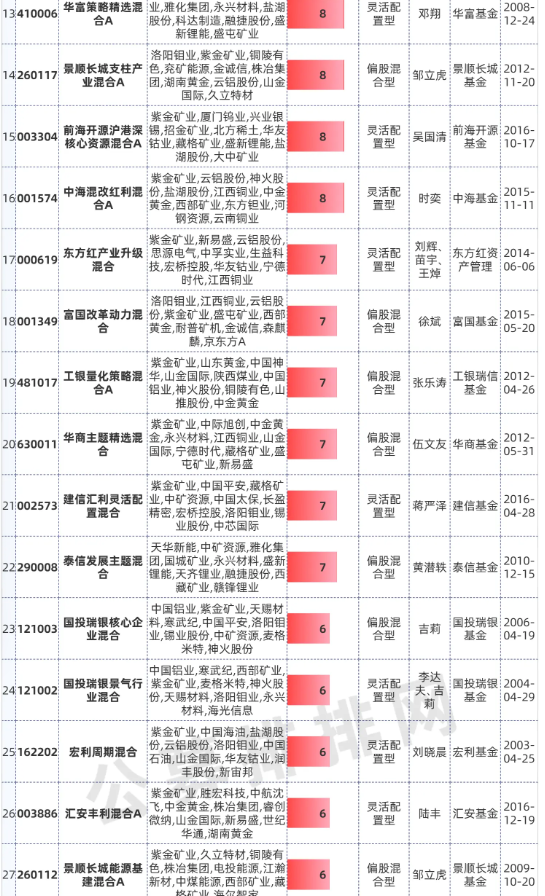 基于公募基金2025年末前十大重仓股的数据,笔者在主动权益基金中筛选出重仓有色金属(持股>5只)的基金共36只,其中9只基金更是全仓布局有色金属板块。从管理人角度看,中邮、前海开源、工银瑞信、国投瑞银等机构均有2只以上产品在列,从持仓集中度来看,紫金矿业、洛阳钼业、华友钴业均获10只以上基金共同重仓。