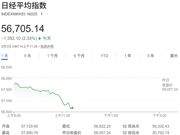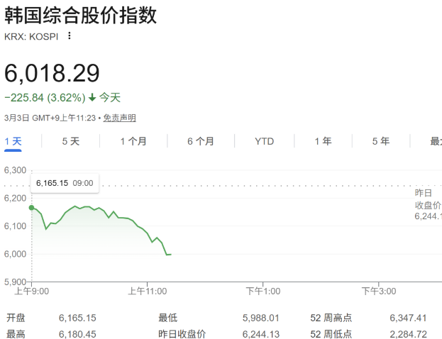 大韩航空股价大跌逾8%,据报道,由于美国对伊朗发动袭击,大韩航空已暂停仁川至迪拜航线,停飞将持续至3月5日。