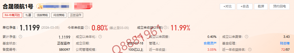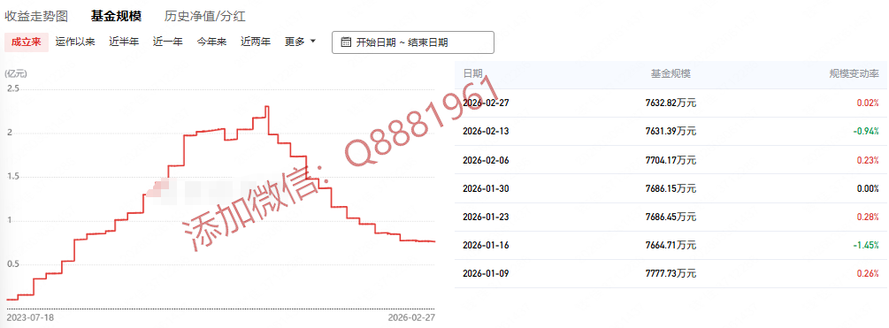 该只私募基金产品为R4中高风险,今年以来的收益为-0.11%,成立0.6年以来的收益为-5.27%,其中我们来看一下具体数据,成立以来的夏普比为-1.79,成立以来的回撤为5.96%,单位净值为0.9473,通过图片,可以观察到这支基金产品的基金规模,截止到2026/2/27的累计净值为0.9473。诚邀进百人私募投资群,深度解析私募策略与收益,百万起投可加微信Q8881961详聊。