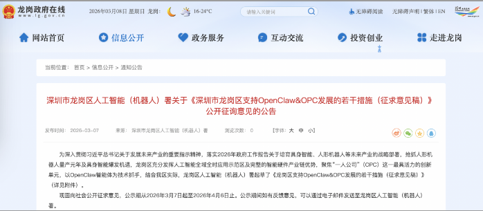深圳市龙岗区人工智能(机器人)署近日就《深圳市龙岗区支持OpenClaw&OPC发展的若干措施(征求意见稿)》公开征询意见。