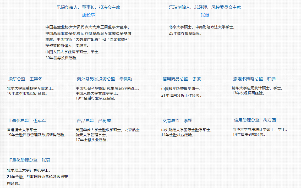 北京乐瑞资产管理有限公司(以下简称“乐瑞资产”)专注于低风险投资之道,立志成为中国债券领域和宏观对冲领域业绩卓越的顶级资产管理公司。乐瑞资产注册资本1亿元,获中关村高新技术企业认证,是中国基金业协会首批资产管理类特别会员和私募证券投资基金专业委员会成员单位,也是首批获准进入中国银行间市场的私募基金管理公司。乐瑞资产管理(香港)有限公司(以下简称“乐瑞资产(香港)”)持有香港证监会颁发的证券投资咨询牌照和资产管理牌照,并于2017年7月成为中国债券通首批备案的境外投资机构。