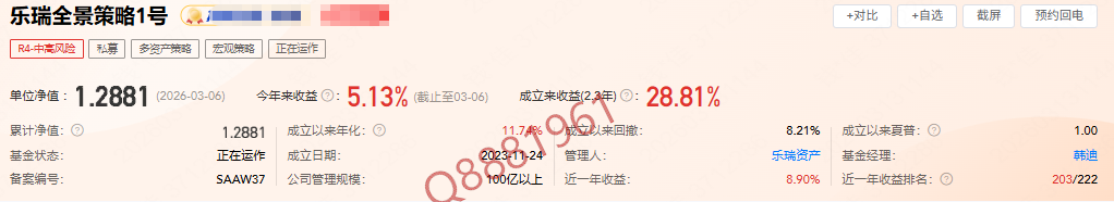 该产品为股票策略型R4中高风险的私募基金产品,其单位净值为1.2881,今年以来的收益为5.13%,成立以来的收益为28.81%,成立以来的回撤为8.21%,通过图片可以观察到该只私募基金产品成立以来的收益走势图。专注量化私募、中证 500/1000 指增,长期跟踪、客观分析,欢迎有需要的投资人加微信:Q8881961。