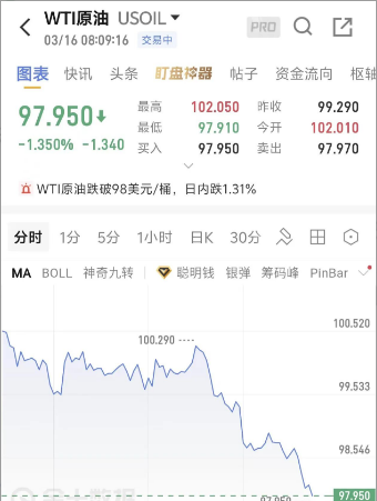 3月16日早盘,国际油价短线走低,原油、布油一度双双失守100美元,WTI原油日内下跌1.34%,报97.95美元/桶。布伦特原油跌破100美元/桶,日内跌0.92%,截至发稿跌幅收窄。