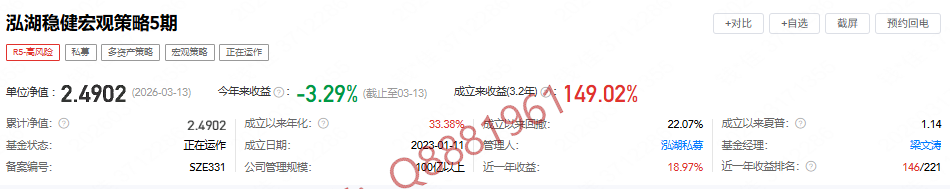 该只私募基金产品为R5高风险,今年以来的收益为-3.29%,成立3.2年以来的收益为149.02%,其中我们来看一下具体数据,成立以来的夏普比为1.14,成立以来的回撤为22.07%,单位净值为2.4902,通过图片,可以观察到这支基金产品的基金规模,截止到2026/3/13的累计净值为2.4902。诚邀进百人私募投资群,深度解析私募策略与收益,百万起投可加微信Q8881961详聊。
