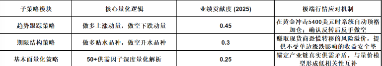 中长周期复合策略:以趋势跟踪、期限结构、基本面量化三大子策略按波动率等权配置,平均持仓15-20天,通过捕捉商品期货市场的趋势、期现价差和供需关系,实现收益。