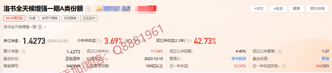该只私募基金产品为R4中高风险,今年以来的收益为3.69%,成立2.3年以来的收益为42.73%,其中我们来看一下具体数据,成立以来的夏普比为1.27,成立以来的回撤为4.40%,单位净值为1.4273,通过图片,可以观察到这支基金产品的基金规模,截止到2026/3/20的累计净值为1.4273。诚邀进百人私募投资群,深度解析私募策略与收益,百万起投可加微信Q8881961详聊。