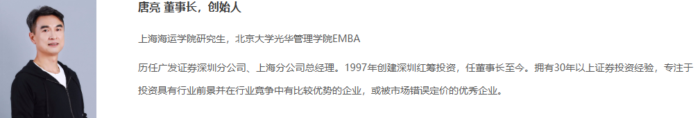 深圳市红筹投资有限公司(简称“深圳红筹投资”或“红筹投资”)成立于1997年6月16日,坐落于深圳蛇口,注册资本9497万元人民币,最新公司净资产超10亿元。2014年5月完成基协私募投资基金管理人备案(编号:P1002489),以二级证券市场投资为主,目前管理证券私募基金总规模100亿左右。