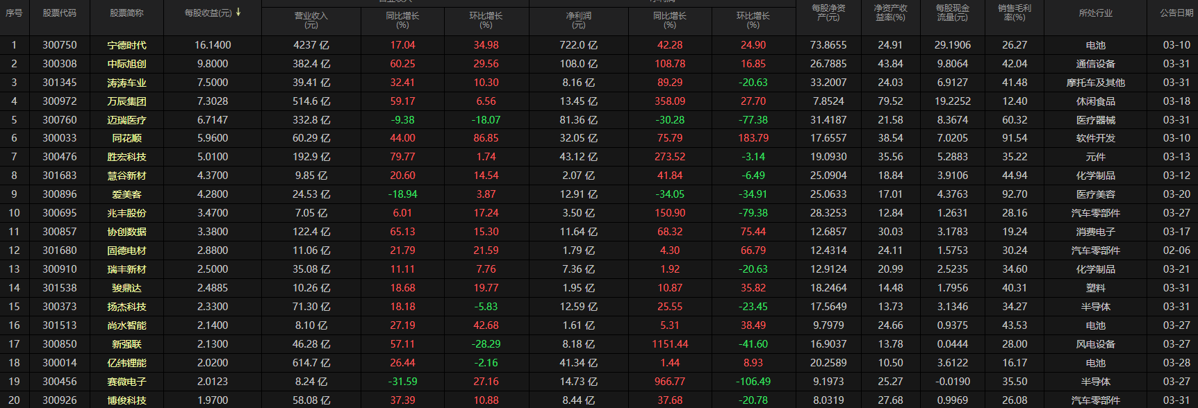 本次创业板前 20 家公司(按每股收益排序)覆盖电池、通信设备、医疗器械、半导体、汽车零部件、消费电子等多个核心赛道,财务表现呈现三大核心特征,可作为网站发布的总结性观点:
