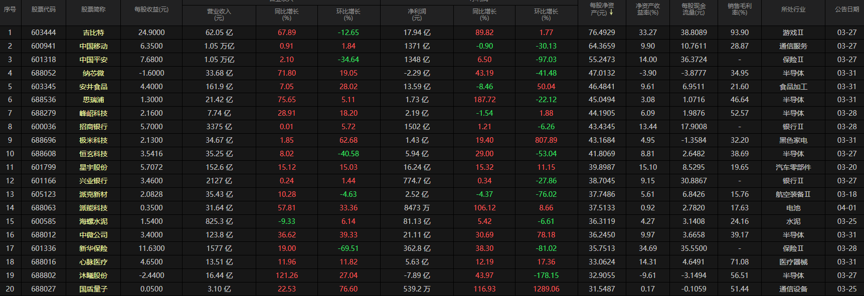 本次沪市 A 股前 20 家公司(按每股净资产排序)覆盖半导体、通信服务、保险、银行、医疗器械、汽车零部件等多个核心赛道,财务表现呈现三大核心特征,可作为网站发布的总结性观点: