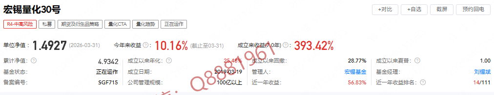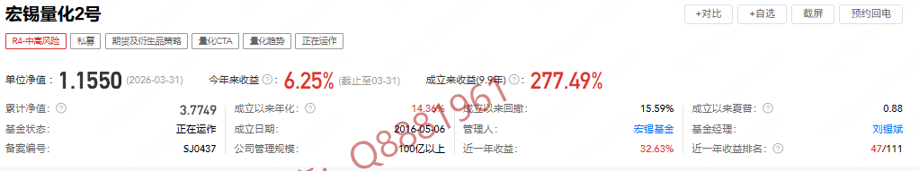 该只私募基金产品为R4中高风险,今年以来的收益为6.25%,成立9.9年以来的收益为277.49%,其中我们来看一下具体数据,成立以来的夏普比为0.88,成立以来的回撤为15.59%,单位净值为1.1550,通过图片,可以观察到这支基金产品的基金规模,截止到2026/3/31的累计净值为3.7749。诚邀进百人私募投资群,深度解析私募策略与收益,百万起投可加微信Q8881961详聊。