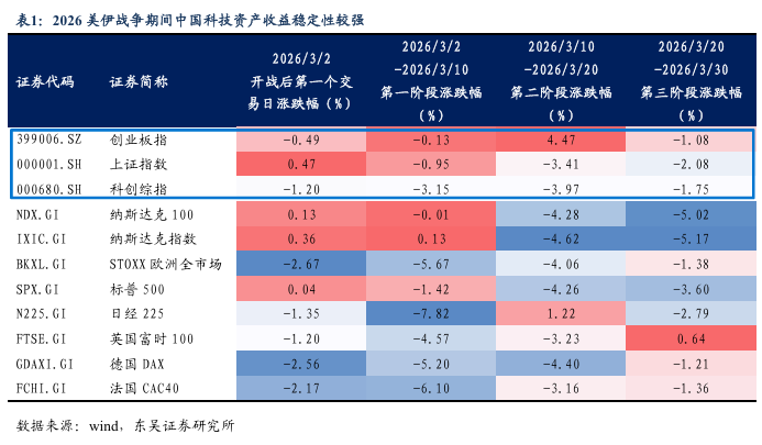 从冲突期间的分阶段表现来看,中国科技资产的优势贯穿全程。开战 后首个交易日,欧洲市场全线走弱,德国DAX下跌2.56%、法国 CAC40 下跌 2.17%、STOXX欧洲全市场指数下跌2.67%,日本日经 225 下跌 1.35%,市场恐慌情绪快速蔓延。同期上证指数上涨0.47%, 创业板指下跌 0.49%,科创综指下跌1.20%,A股整体波动显著低于 海外市场,科技板块虽有小幅调整,但未出现非理性抛售,资金承接 力较强。