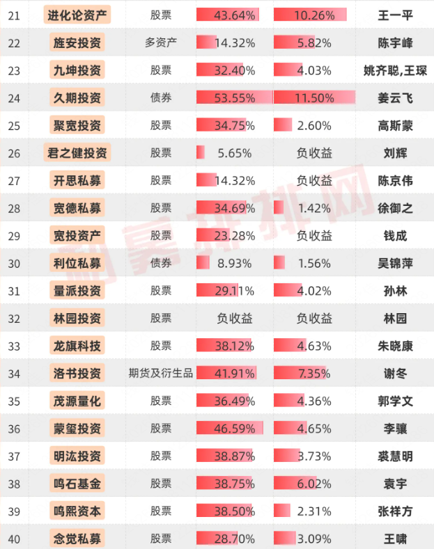 其中,王一平掌舵的进化论资产,有16只产品在私募排排网有近1年业绩展示,近1年收益均值为43.64%,今年一季度的收益超10%。