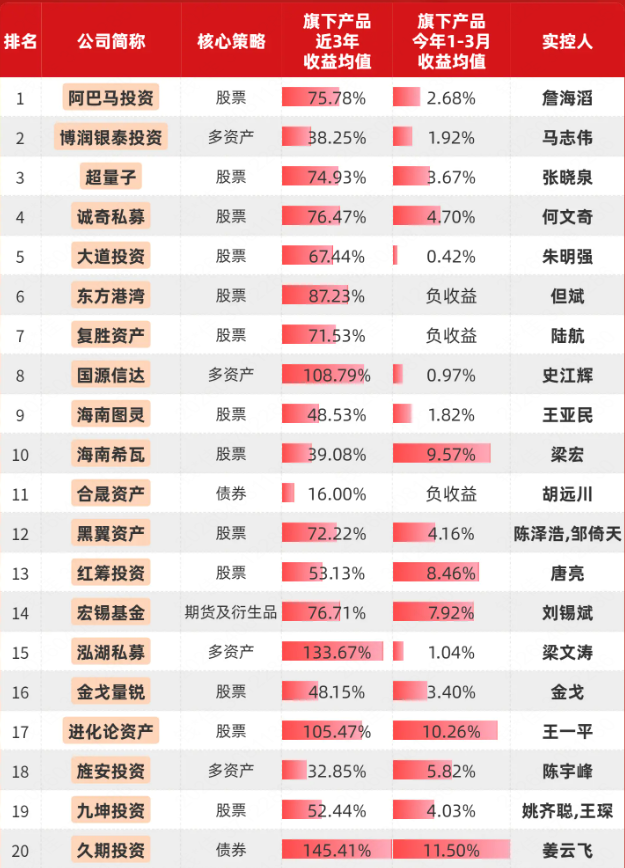 东方港湾、国源信达等61家百亿私募有近3年业绩展示
