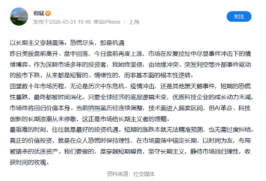 受美伊冲突影响,美股科技股在3月份出现了一定的回撤。对于冲突导致的回撤,但斌发文表示“回望数十年的市场历程,黑天鹅事件导致的短期恐慌性暴跌,最终都被时间消化。只要全球经济的底层逻辑未变,优质科技企业的成长动力未减,市场终将回归价值本身。当前纳指虽历经连续调整,技术面进入超卖区间,但AI革命、科技创新的长期浪潮从未停歇,这正是市场给长期主义者的馈赠。最艰难的时刻,往往就是最好的投资机遇。短期的涨跌本就无法精准预测,也无需过度纠结”。头部私募基金,长期跟踪帮助投资人分析市场,根据市场走势配置私募产品,欢迎添加我微信Q8881961