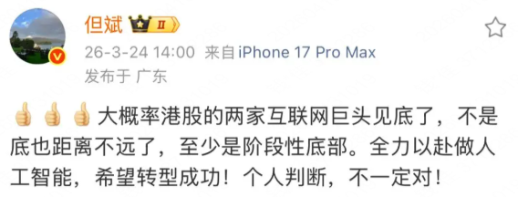 3月24日,但斌在社交媒体上发文称,“大概率港股的两家互联网巨头见底了,不是底也距离不远了,至少是阶段性底部。全力以赴做人工智能,希望转型成功。个人判断,不一定对”。