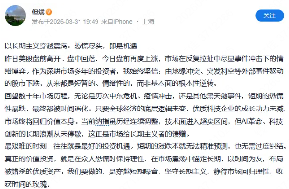 与去年面对关税冲突导致的市场恐慌杀跌一样,对于近期市场因中东冲突导致的调整,但斌依然很淡定。3月31日,但斌发文表示,以长期主义穿越震荡:恐慌尽头,即是机遇。