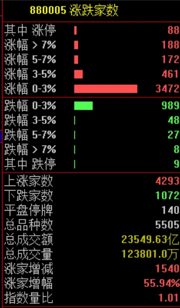 市场共4293只个股上涨,88只个股涨停,1072只个股下跌。