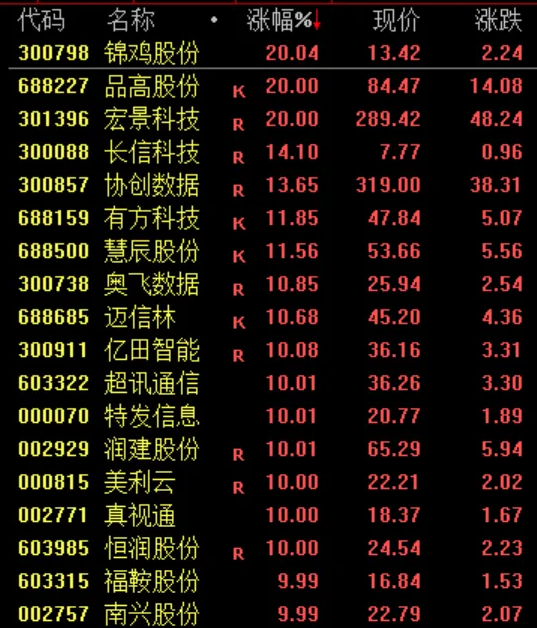 算力产业链持续爆发,其中算力租赁方向表现突出,真视通、美利云等多股涨停。
