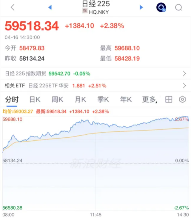 4月16日,日经225指数创下历史新高,在亚洲市场整体上涨的背景下走强,跟随隔夜华尔街涨势,因市场对美伊达成协议的预期升温。