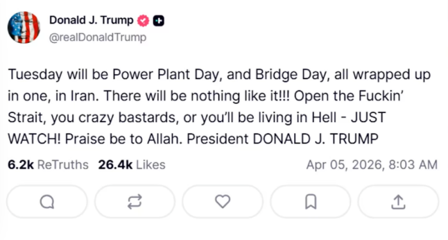 复活节后的星期二,他发出了总统任期内最引人注目的最后通牒,称除非伊朗在 12 小时内达成协议,否则整个文明将会灭亡。