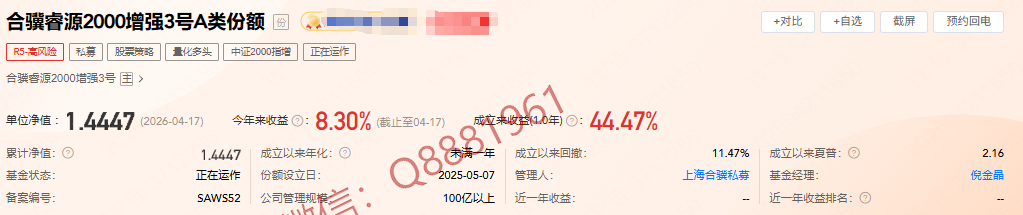 该产品为股票策略型R4中高风险的私募基金产品,其单位净值为1.4447,今年以来的收益为8.30%,成立以来的收益为44.47%,成立以来的回撤为11.47%。通过图片可以观察到该只私募基金产品成立以来的收益走势图。专注量化私募、中证 500/1000 指增,长期跟踪、客观分析,欢迎有需要的投资人加微信:Q8881961。